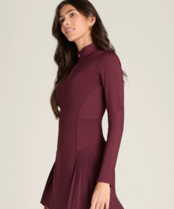 Thiết kế: Form đầm dài tay hiện đại với cổ polo và khóa kéo nửa thân trước, kết hợp chân váy xếp ly tạo sự linh hoạt và nữ tính.