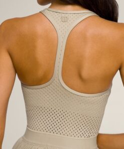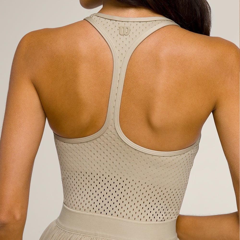 Các lỗ thông hơi (perforations) cho phép không khí lưu thông. Thiết kế racerback siêu mỏng giúp đôi vai cử động tự do. Phần quần lót bên trong (liner) giữ bóng tennis dự phòng và điện thoại di động của bạn ở gần. Khi bạn lướt trên sân, phần chun co giãn óng ánh (iridescent elastic) và chân váy bóng mượt (shiny skirt) sẽ bắt sáng.