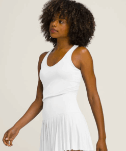 Thiết kế: Dáng váy liền hiện đại, thân trên ôm nhẹ và chân váy xòe gọn giúp sải bước mượt mà. Phần vai mở rộng hỗ trợ tăng biên độ vung vợt.