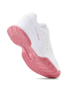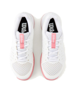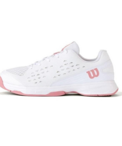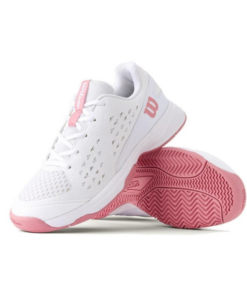 Hoàn thiện & chi tiết nổi bật: Logo Wilson sắc nét, upper trắng mauve hiện đại, chất liệu bền dễ vệ sinh – lựa chọn đáng tin cậy cho các tay vợt nhí cần sự êm ái và hỗ trợ tốt.